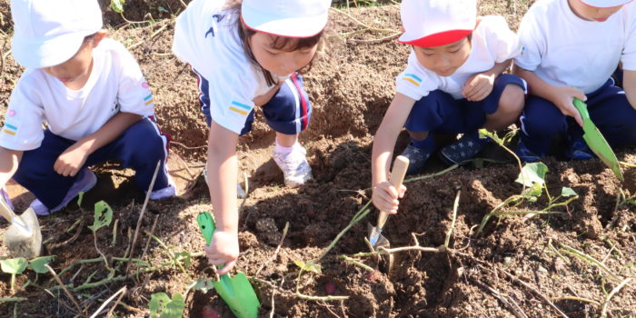 今日は年長組みんなで電車に乗って、楽しみにしていたお芋掘りに行ってきました。 電車に乗り、少し歩いていくとお芋畑に到着。 畑の管理人さんにご挨拶して、それぞれスコップをもってお芋掘りスタート! …