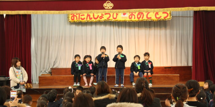 明日2月3日が節分の日ということで、幼稚園で豆まきをしました。 「あそこに鬼がいてるで―!」すると隠れていたたくさんの鬼が「ガオー!」と出てきました。 「鬼は外!福は内!」鬼に向かってみんなで豆を投げてまし …