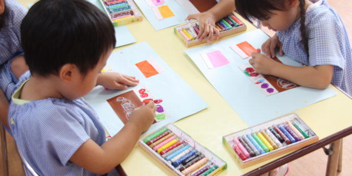 11月の絵画造形展に向け、ただいま造形作品を制作中。 年中組さんはひらがなの書き方を練習しています。