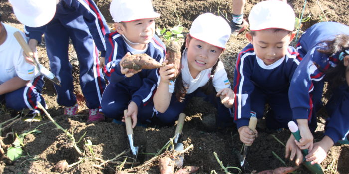 今日は年長組さんのみんなでおいもほりに行ってきました。 お天気にも恵まれ、楽しみのお芋畑までみんなで出発。 さあ今からスコップとみんなの小さな手を使って、お芋さんがなっている畑の土を掘ってみよう! 今年はど …