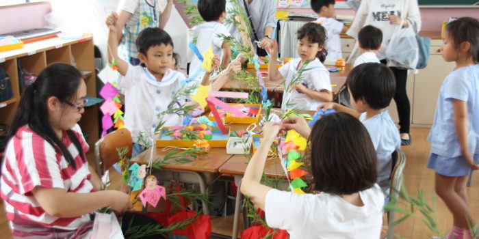 今日は家族の人たちがみんなの保育の様子を見に来てくれました。 年少組さんでは、お歌やカスタネット演奏を家族の人たちに披露しました。 7月7日の七夕に合わせて笹の飾りつけをしました。 おり姫、ひこ星やカメさん …