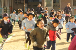 今朝は昨日よりも一段と寒くなっていましたが、園児たちは今日もランニングで体を温めました。