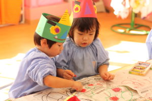 鬼のお面を作成している年少さんの様子です。