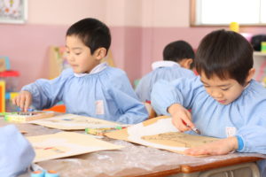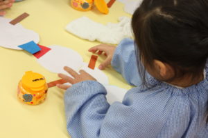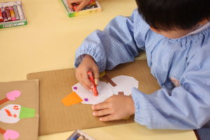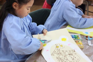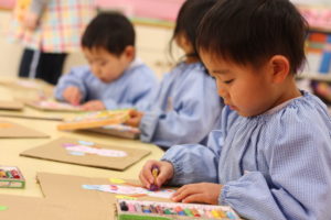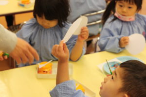 画用紙で雪だるまさんを制作中の年少組さん。