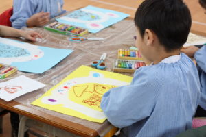雪のかまくらと中で遊ぶ動物の絵やを描いている年長さん。