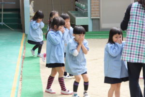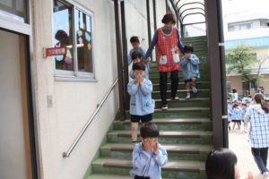避難訓練がはじめての年少組のみんなは、とつぜん火災報知機が鳴り響いたことで驚いた様子でしたが、みんな先生の話を聞いていたからちゃんと避難することができました。