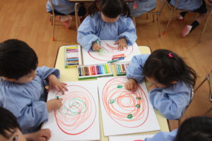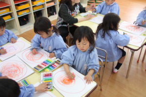 スパゲティの絵を描いる年少組さん。