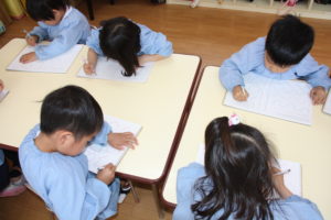 年中組さんはえんぴつを使って書く練習をしました。