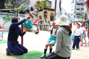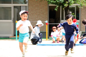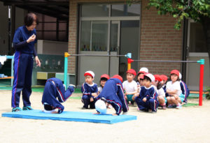 マット体操では前転やブリッジをして、そのあと園庭を全力疾走で走ったり、鉄棒で逆上がりの練習をしました。