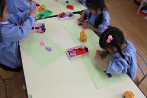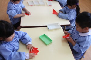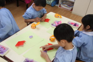 年中クラスでは、色紙を使ったチューリップの折り紙作りを楽しみました。