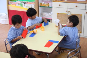 年少組さんは、色紙とのりを使って電車作りをみんなで楽しみました。