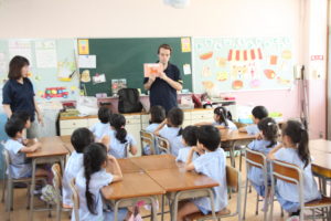 ライアン先生とえみこ先生がカードを使って英語を楽しく教えてくれます。