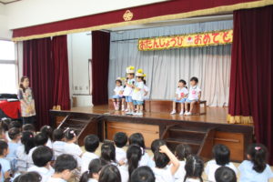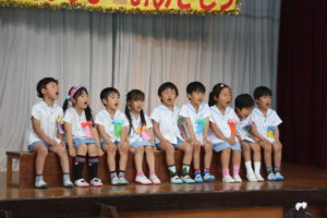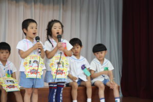 年少のみんなも、初めてステージでマイクを使って、みんなに自己紹介をしたりお歌を歌いました。