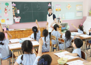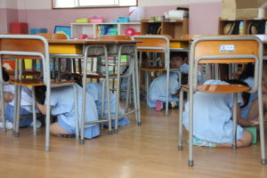 地震がきたらすばやく机の下にもぐって頭を守る訓練、そして屋外へ避難する練習などをしました。