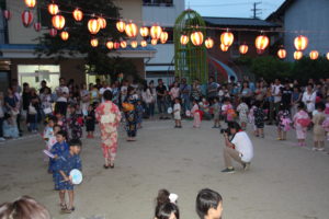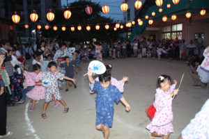 ほのかに光る提灯の下で、この日のために練習してきた盆踊りをお家の人たちに披露しました。