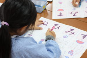 その文字で始まる言葉を考えて、それをみんなで言い合っていろんな言葉があることを発見したり、えんぴつを使った書き方の練習をしました。