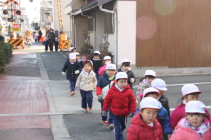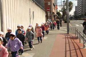 先生の笛の音に合わせ、ピッピッ ”ファイト~!”の元気な掛け声と一緒に公園を目指しました。