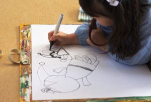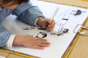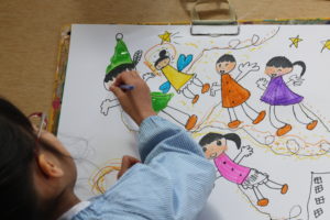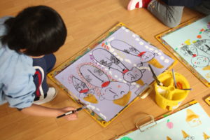 年中組のみんなは”笠地蔵”を。年長組のみんなは”ピーターパン”の絵本をテーマにして、それぞれ感じたイメージを素直に絵に表現してみました。