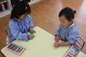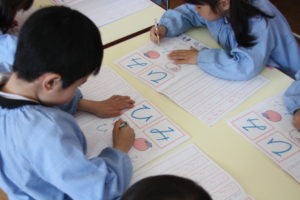 年中組さんではひらがなの書き方を練習しました。