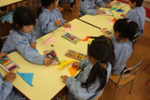 年少組さんは折り紙でお船つくりをしました。