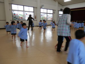 年少組のみんなはホールで裸足になってリトミック遊びを楽しみました。