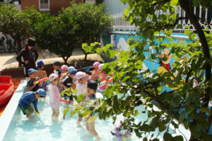 暑さがちょうど良く、園児たちは水の中でみんな大はしゃぎ!