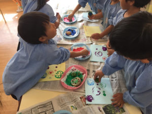 年中組さんは何やら楽しそうにいろんな素材や形のスタンプで彩っていますё