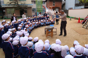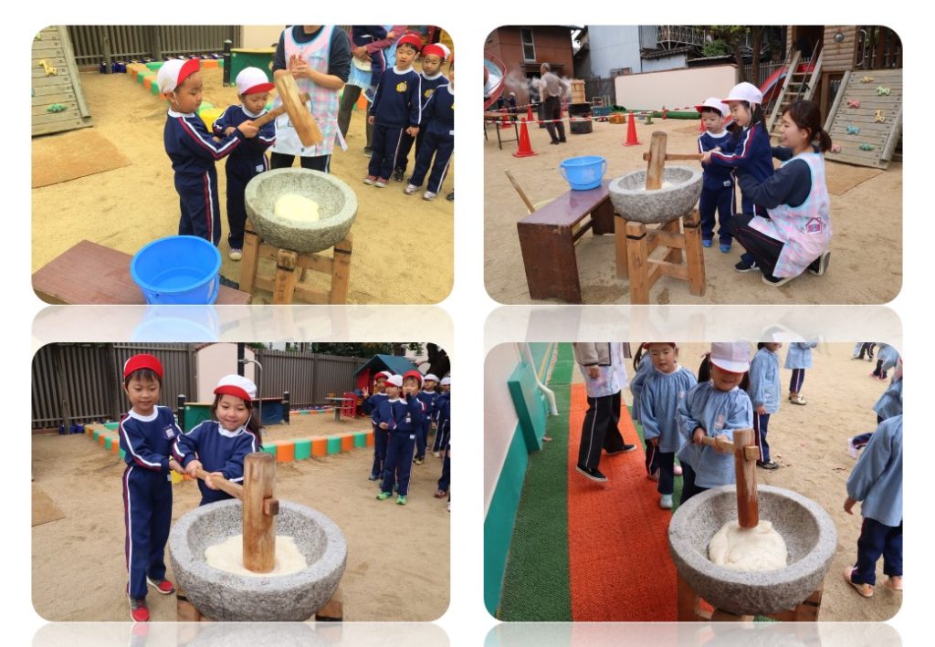 園長先生がみんなにお手本を見せてくれたあと、園児たちみんなできねを持っておもちつき体験を楽しみました。