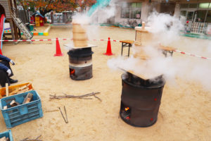 園長先生が大きなかまどを使って、たくさんのもち米を蒸して温かくしてくれた後、ウスのなかに入れたらお餅つきの始まりです。