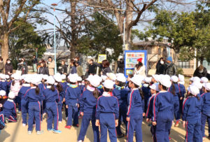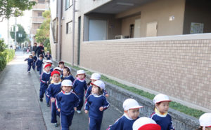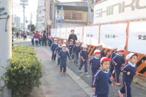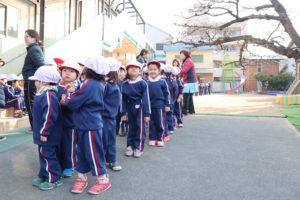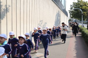 快晴でマラソン日和のなか、幼稚園をスタート地点として、年少組から年長組まで、先生と一緒にみんなで、近くにある聖天山公園を目指して出発!