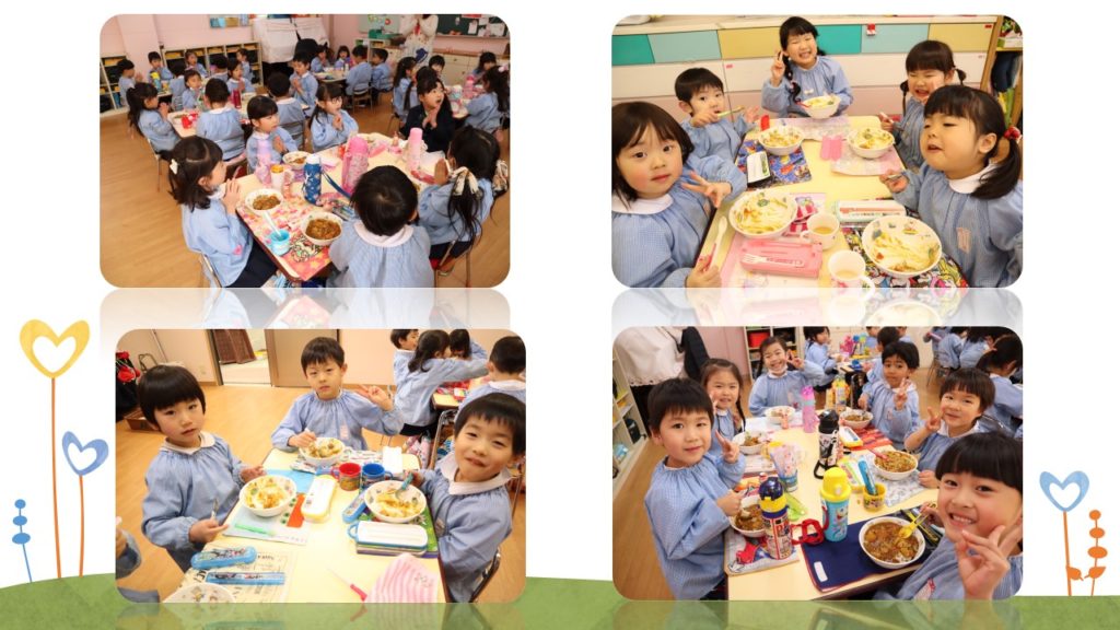 お昼ごはん年長組さんがそれぞれのお部屋に来てくれて、仲良く一緒にカレーを食べましたё