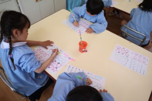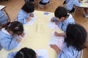 年中組さんは、えんぴつで、いろんな形の線をなぞってみる練習をしました。