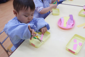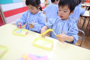 年少組さんは、はさみを持ってみて紙を切る練習をしました。