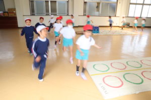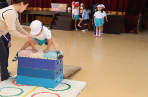 年長組さんはカワイ体操が始まりました。みんなと一緒にブリッジやとび箱、鉄棒の練習をしました。