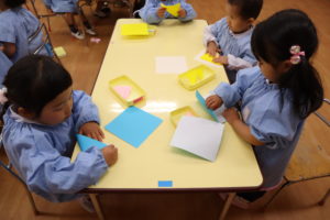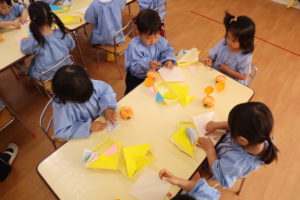 年少組さんでは、折り紙とのりを使って、ちょうちょの制作にチャレンジしました☆