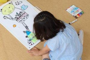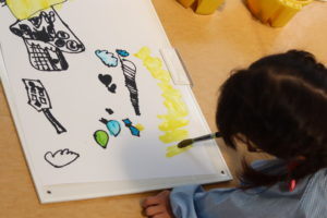 今日は絵画の絵画の先生と一緒に、ペンと絵筆を使ってお絵描きをしました。(年中組・年長組)