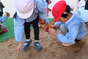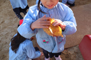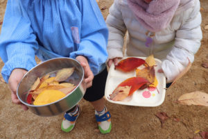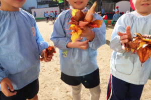 虫に食べられ穴が空いた葉っぱやちぎれた葉っぱ、いろんな色や形をした葉っぱを手にとってお友達と見せ合いっこしていますё