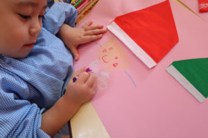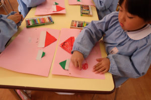 今日は、年少組では折り紙とクレパスでサンタさんを描いてみました。
