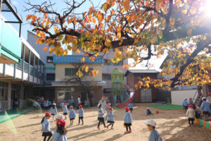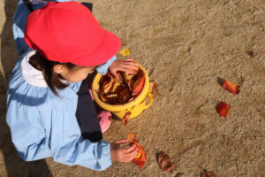 今朝園庭を見てみると、紅や黄色く染まった桜の落ち葉がたくさん落ちていました。