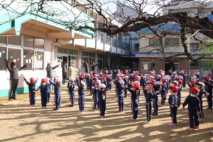 幼稚園をスタートして、先生と一緒にみんなで近くの聖天山公園まで走ります。