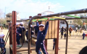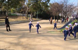 先生の笛の音に合わせ、ピッピッ ”ファイト~!”の元気な掛け声と一緒に公園を目指しました。