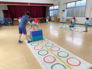 マットの上でカエルさんジャンプやクマさん歩きをしたり、跳び箱や鉄棒を使って体を動かしてみました。