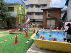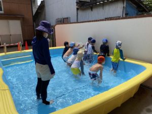 プールは順番ずつに入る予定なので、まだプール遊びがないお友だちは水風船で遊んでみました☆
