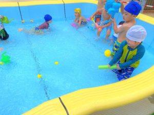 今日はいちご組さんの番です。幼稚園の初めてのプール遊びё