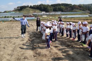 畑を管理する施設の方のお話を聞いて、お芋掘りスタート!