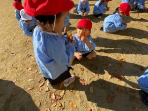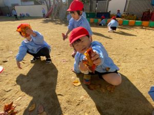 ”100枚集めたよ!”とたくさんの落ち葉を見つけながら、赤や茶色や黄色の色の違いを確かめ合ったりしていますё