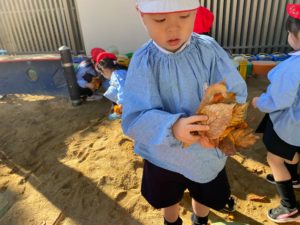 子どもたちにとっては落ち葉あつめも楽しい遊びです。