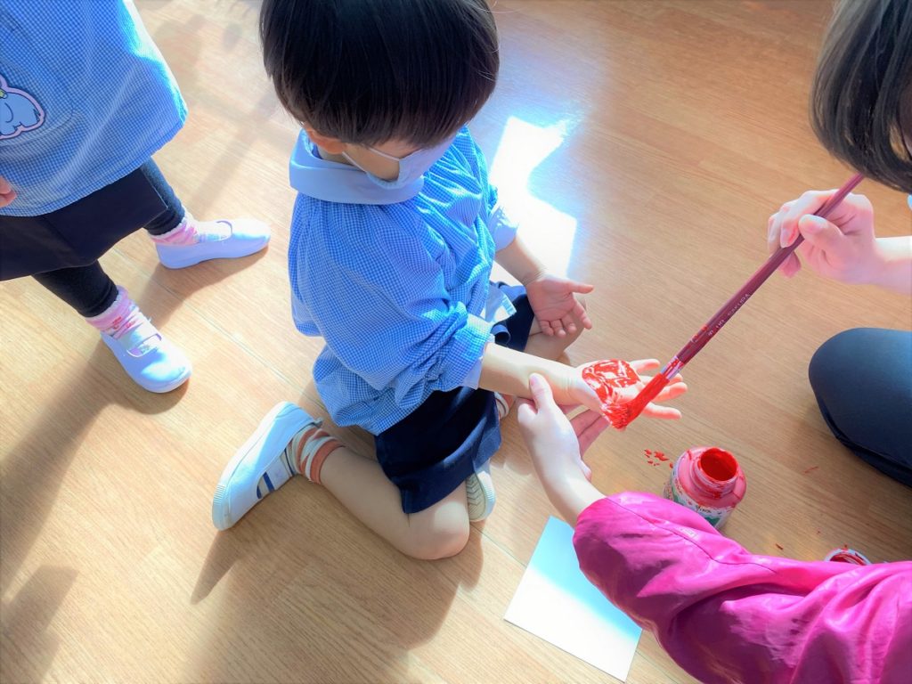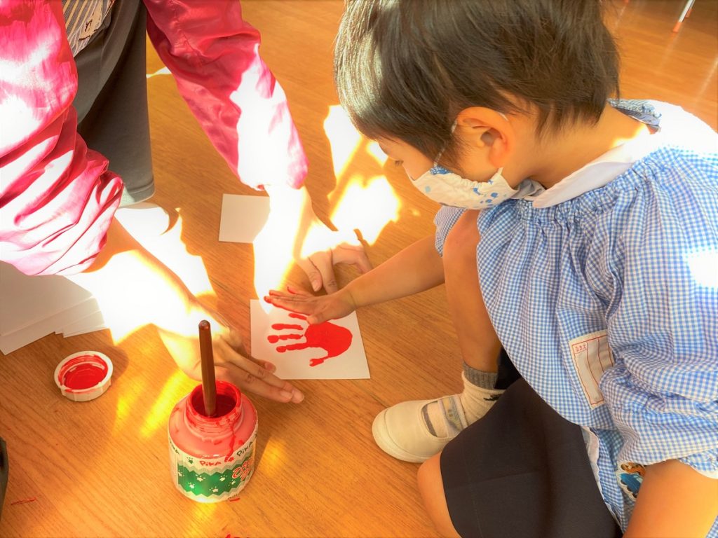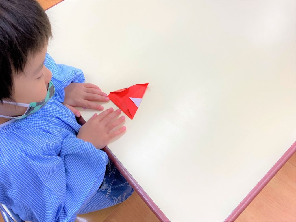 年少組さんでは折紙でサンタさんの帽子を作ってみたり、手のひらのハンコでぺったんこしてみました。
