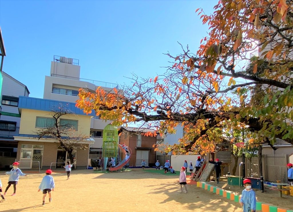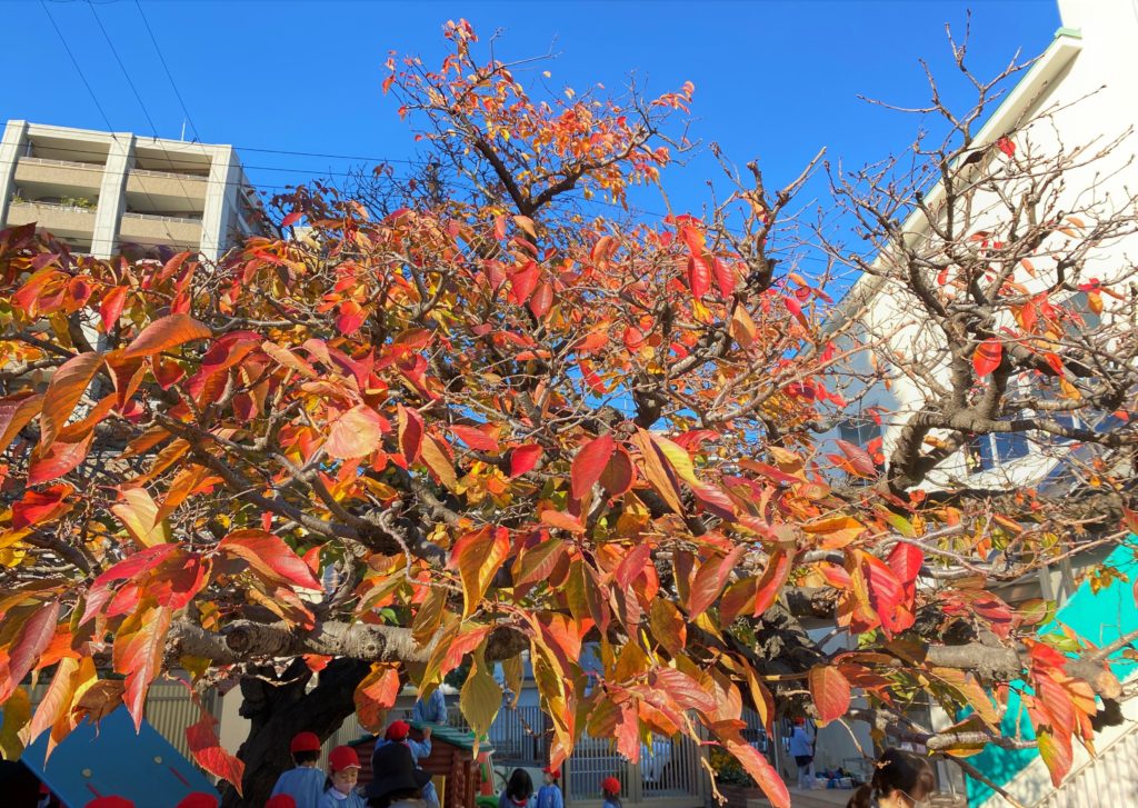 幼稚園の木もすっかり紅く染まり、冬らしい色彩へと様変わりしました。