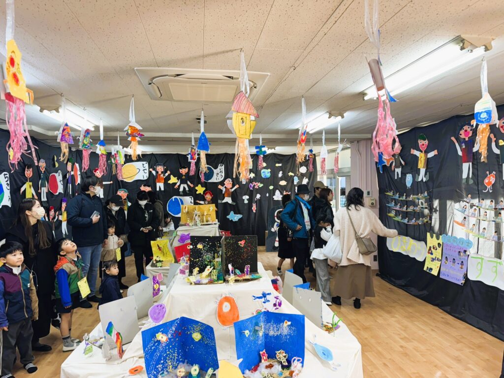 子どもたちが日々の遊びや活動を通して取り組んできた絵画や造形作品を、園内いっぱいに並べ、ご家族の皆さまにご覧いただきました🎨